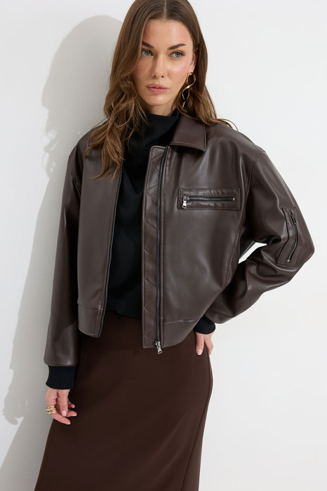 Жакет прямого силуэта из экокожи. Воротник отложной, по центру застежка на молнию. Жакет с удлиненной линией плеча, рукав одношовный втачной, по низу рукава манжета (из трикотажного полотна). По переду рельефы с функциональными карманами и декоративный элемент с молнией. На спинке кокетка. По низу жакета притачной пояс (из трикотажного полотна). Жакет на подкладке. Обращаем ваше внимание, что фурнитура может отличаться от фото.