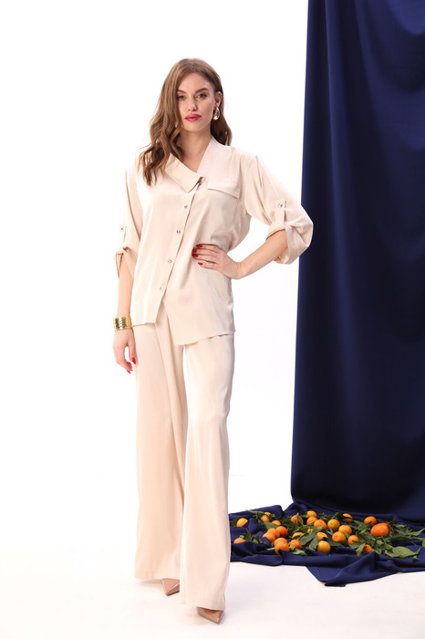 Жакет рубашечного типа прямого силуэта с асимметричным низом. Рукав втачной со спущенной линией плеча, фиксируется на пату. Застежка центральная на петли и пуговицы, смещённая по косой. На левой полочке накладной карман с клапаном. Воротник отложной на стойке до половины спинки.