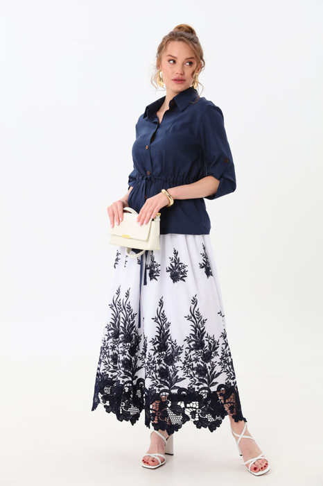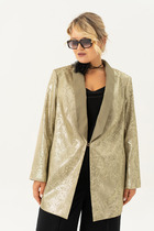 Жакет прямого силуэта, воротник пиджачного типа, рукав одношовный, втачной с незначительно спущенной линией плеча, длиной три четверти, с патой. По линии ткани настрачная кулиса с завязками из основной ткани. Застежка центрально-бортовая. Линия низа верхней части фигурная ассиметричная.