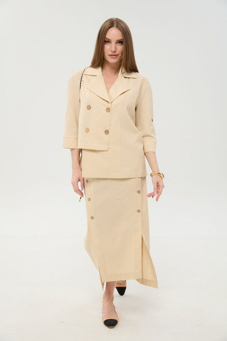 Жакет прямого силуэта с имитацией центральной застёжки на пуговицы. Рукав втачной одношовный, длиной три четверти,застегивающийся на пату. Воротник пиджачного типа . Линия низа фигурная, симметричная .