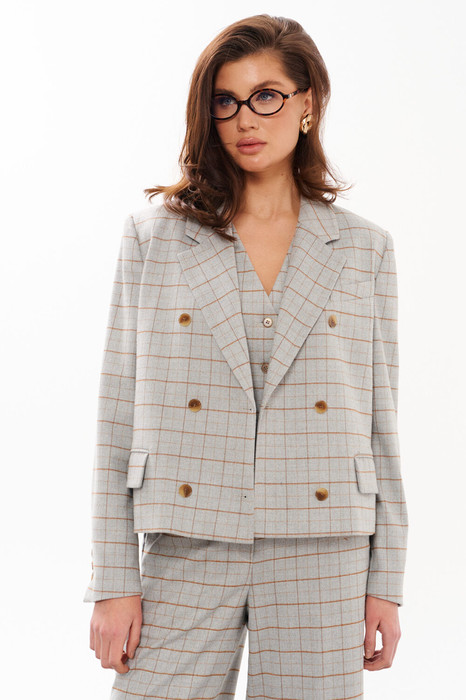 Жакет женский из смесовой ткани в клетку для повседневной носки. Жакет полуприлегающего силуэта. Жакет двубортный, застежка на две обметанные петли и две пуговицы. Перед имеет два вертикальных рельефа, идущих от проймы до низа изделия, а также на переде располагается нагрудный карман с листочкой. По переду имеется карман с клапаном и двумя обтачками. Спинка со средним швом и с двумя рельефами, идущими от проймы до линии низа изделия. Горловина обработана пиджачным воротником. Рукава двухшовные с шлицей по низу рукава, на шлице имеются четыре пуговицы. Жакет на поливискозной подкладке Данное изделие станет отличным дополнением к любому гардеробу. И обязательно осчастливит его обладательницу своим прекрасным фасоном.