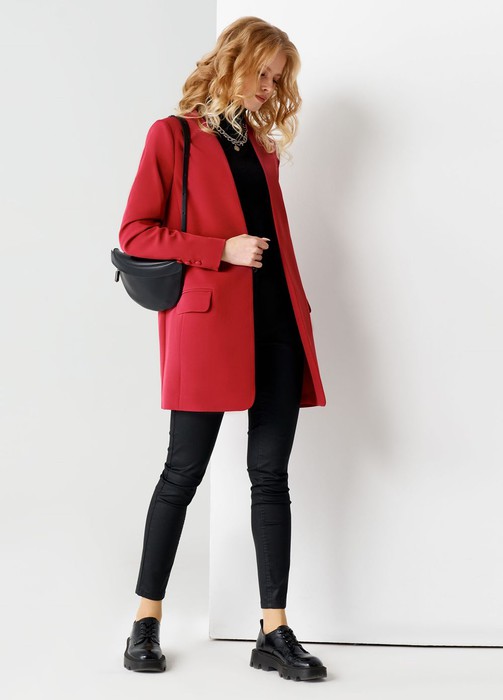 Стильный модный жакет. Это повседневный удобный и практичный жакет, который отлично сочетается как с джинсами, так и с брюками. Жакет удлиненный, без застежки, рукава длинные. По переду имеются карманы с клапаном. Жакет на подкладки.