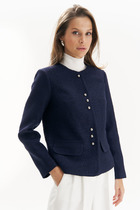 Текстильный классический жакет прямого кроя. Детали: жакет полуприлегающего силуэта, пиджачный воротник, перед с прорезными карманами, двубортная застежка на петли и пуговицы, спинка со средним швом, рукава втачные двухшовные, жакет на подкладке
