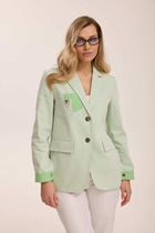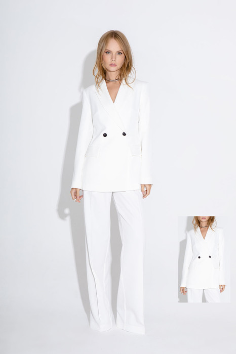 Классический приталенный жакет из текстильной ткани. Детали: жакет с отрезными бочками и нагрудными вытачками, пиджачный воротник, прорезные карманы, двубортная застежка на петли и пуговицы, спинка со средним швом, втачные двухшовные рукава, жакет на подкладке
