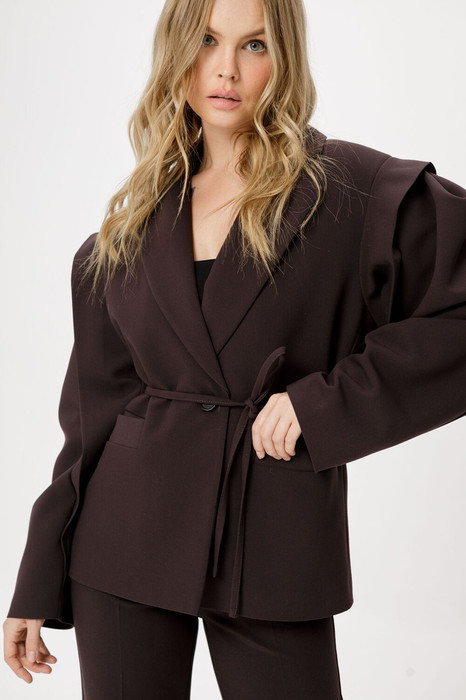 Детали: прямой силуэт, удлинённая линия плеча, втачной одношовный рукав с ассиметричными складками, функциональные карманы, центральная застёжка на петлю и пуговицу, жакет на подкладке.