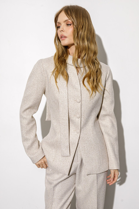 Детали: жакет полуприлегающего силуэта, цельнокроеная стойка, застежка на петли и пуговицы, имитация нагрудного кармана, рукава фигурные длинные с верхним швом и объемными плечевыми накладками, съемный шарфик.