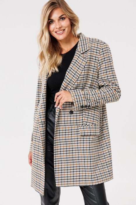 Жакет женский на подкладке из текстильной ткани, двубортный, оверсайз. По переду расположены талиевые вытачки с прорезными карманами с клапаном. Спинка со средним швом и шлицей. Рукав двухшовный со шлицей на петлях-пуговицах. Застежка жакета двубортная на петлях-пуговицах. Вырез горловины оформлен воротником с лацканами.