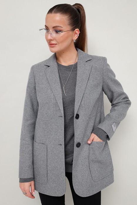 Стильный жакет полуприлегающего силуэта, выполнен из костюмной ткани. Воротник пиджачного типа с отложными лацканами. Застежка центральная на петли и пуговицы. Спереди обработаны накладные карманы, в области груди подрезы с нагрудными вытачками. Спинка с рельефами и средним швом, переходящим в шлицу. Рукава втачные двухшовные, на левом рукаве декоративная нашивка. Изделие на подкладке.