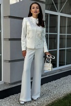 Стильный жакет полуприлегающего силуэта, выполнен из костюмной ткани. Смещенная застежка на петлю и пуговицу. Воротник пиджачного типа с отложными лацканами, край борта скругленный по низу жакета. Спереди обработаны прорезные карманы в рамку с клапанами. Рукава втачные, двухшовные со шлицами с застежкой на петли и пуговицы. Спинка с рельефами и средним швом. Жакет на подкладке.