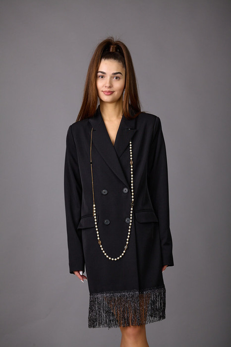 Представляем жакет женский из костюмной ткани на подкладке,который станет  незаменимым спутником в вашей жизни. Лаконичный прямой силуэт жакета с двубортной застежкой прекрасно сочетается с бахромой. По переду- прорезные карманы с клапанами.  Воротник-с отложными лацканами пиджачного типа. Рукава двухшовные, длинные. Жакет можно носить, как самостоятельно, так и в  сочетании с платьями- комбинациями, юбками, брюками. Длина жакета 44-48р - 82см +10см бахрома, 50-54р- 84см+10см бахрома