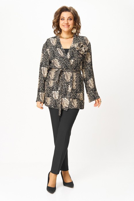 Жакет женский свободного прямого силуэта, длиной ниже линии бедер.  Жакет без подкладки со съемным поясом и накладными карманами.  По переду и горловине спинки притачная планка, без застежки. Линия плеча слегка спущена. Рукав втачной длинный с отложной манжетой. В боковых швах разрезы. Украшен жакет съемным цветком из отделочной ткани.