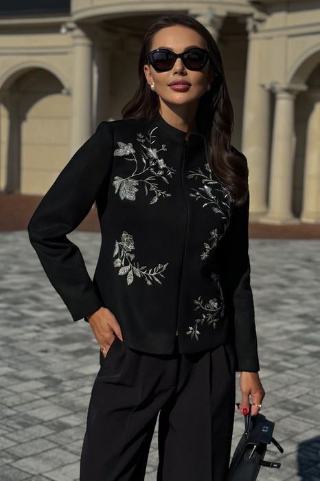 Жакет женский нарядный, полуприлегающего силуэта, выполнен из мягкой искусственной замши на трикотажной основе, с центральной бортовой застежкой "встык" с разъемной потайной молнией. Молния расположена на расстоянии 5,0 см от низа и заканчивается у воротника-стойки. Жакет на подкладке. Перед и спинка оформлены художественной вышивкой.