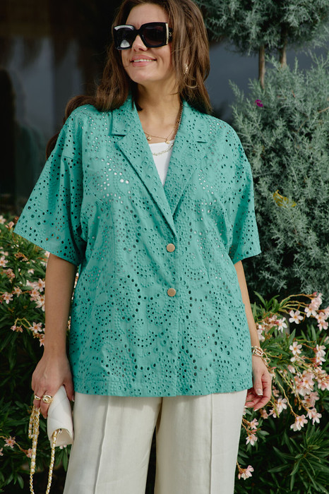 Жакет летний небольшого объема полуприлегающего силуэта в тренде сезона на каждый день из кружевного хлопка Ришелье. Пластическая форма мягкая, плавная. Жакет однобортный без подкладки с застежкой на две металлические кнопки в оттенке матовое золото и классической формой лацкана и воротника. Плечевой пояс наклонный, с спущенным рукавом до локтя. Форма жакета по переду в верхней и средней части решена конструктивными линиями и рельефами, из которых выходят линии карманов. По спинке выполнен горизонтальный рельеф- кокетка с выходящими из него фигурными линиями рукава. Прекрасно скроенный жакет идеально сядет на фигуру, модель комфортна натуральными материалами, она идеальна для летних прогулок, торжества. Его удобно сочетать с прямыми брюками, юбкой, платьем. Современный фасон подходит для повседневных образов и создает женственный силуэт, делает акцент на фигуру, придает уверенности.  Мы используем натуральные ткани с заботой о вашем комфорте. Длина жакета 73 см, длина рукава 44 см (р 52-56), 45 см (р 58-62).