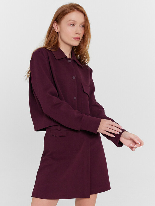 Жакет женский прямого силуэта, укороченый. Горловина круглой формы с втачным стояче-отложным воротником. Перед с центральной застежкой на кнопки. На левой передней детали накладной карман с клапаном. Рукав втачной, длинный. По низу рукава отрезная манжета из основного полотна и заложена складка. Спинка с отрезной кокеткой, на спинке заложены две складки. Нижний срез жакета обработан швом вподгибку.
