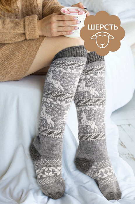 Теплые новогодние гольфы для женщин выполнены с высоким содержанием натуральной овечьей шерсти. Высокие шерстяные носки с рисунком Олени идеальны для уютных вечеров. Яркий узор добавит приятных эмоций, а теплая пряжа согреет в прохладное время года.