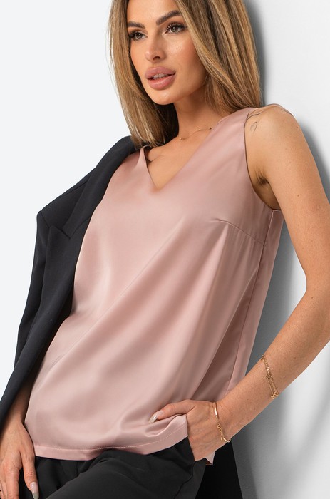 Светло-розовый топ выполнен из легкой, прохладной шелковистой ткани, которая практически не мнется. Однотонный топик — идеальный вариант на лето. Офисная модель для женщин идеально садится на любую фигуру благодаря прямому крою и делает силуэт более стройным. Соблазнительный V-образный вырез акцентирует зону шеи и ключиц.