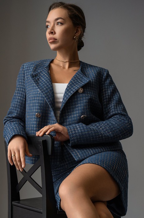 Почувствуйте себя изысканной и уверенной в этом женском костюме с юбкой в сине-голубых тонах. Элегантный комплект сочетает двубортный жакет и короткую юбку, создавая образ, готовый для любых случаев — от деловых встреч до повседневных прогулок. Его универсальность и стиль позволят выглядеть безупречно в любой ситуации.