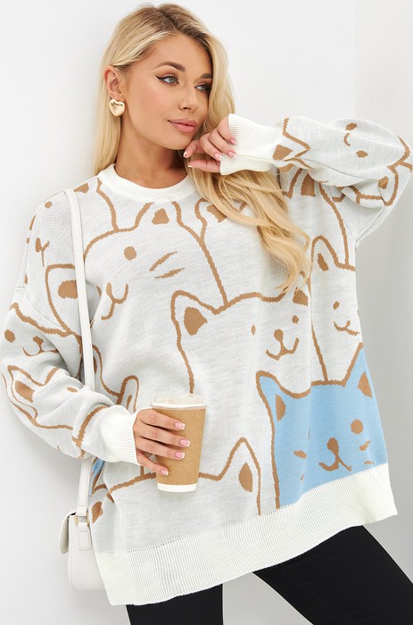 Женский джемпер с рисунком кошки — находка для тех, кто любит весело и тепло проводить зимние дни. Свитер оверсайз с оригинальным рисунком наполнит уютом каждый день.