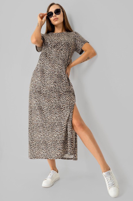 Летнее платье футболка с принтом Леопард выполнено из 100% хлопкового трикотажа кулирная гладь. Длинное женское платье с коротким рукавом – универсальная база на каждый день. Леопардовый принт добавляет изысканности и непринужденности.