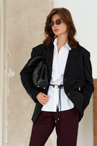Жилет полуприлегающего силуэта. V-образная горловина с отложным воротничком переходит в запах. Низ ассиметричный, полочка удлиненна. Спинка со среднем швом.
