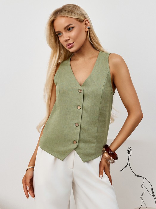 Жилет молодежный из плательной ткани "лен-вискоза" полуприлегающего силуэта с рельефными вытачками на полочке, рельефами на спинке для комфортной посадки по фигуре, без подкладки, с центральной бортовой застежкой на петли и пуговицы.