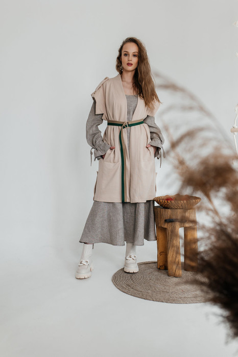 Жилетка   "АМУЛЕТ" с декоративными патами на плечах и по низу, невероятно комфортная и красивая одновременно. Эта жилетка  будет самой любимой в Вашем гардиробе. Все изделия коллекции "АМУЛЕТ" созданы из натуральной ткани, имеют сложно-обработанные внутренние швы и энергосберегающий крой.