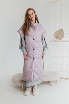 Жилет укороченный, выполнен из стеганной трикотажной ткани серого цвета. Характеристика: жилет А-силуэта, вортник стойка, капюшон цельный с жилетом, центральная застежка на молнию, скрывается под планкой на кнопках, боковые карманы на молнии, по низу изделия резинка с фиксаторами, брендированный подклад, спинка цельнокройная. Длина изделия от края горловины по спинке 58см.