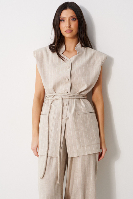 Жилет прямого кроя, выполнен из льняного полотна бежевого цвета в белую полоску. Характеристики: прямой крой, воротник-стойка, подплечники, по переду накладные функциональные карманы с прорезью, застежка центральная на пуговицы, пояс-жгут. Длина изделия 73см.