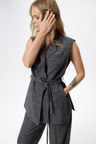 Жилет с центральной застежкой на петли и пуговицы, с V-образным вырезом горловины. По переду с талиевыми вытачками, прорезными карманами с листочкой. Спинка со средним швом, рельефами, выходящими из проймы. Низ жилета фигурный.