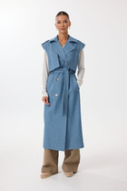 Жилет удлиненный свободного прямого силуэта, воротник пиджачного типа. Линия низа по переду и спинке фигурная ассиметричная. Короткий рукав-крылышко. Талия фиксируется съемным ремнем из экокожи, для которого в боковых швах оформлены шлевки. Ремень идёт в комплекте к изделию.