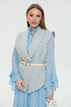 Детали: жилет прямого силуэта, талиевые вытачки переда и спинки, пиджачный воротник, застежка на пришивные кнопки, спинка со средним швом и шлицей, функциональные карманы, жилет на подкладке, в комплекте пояс из основной ткани и чёрный пояс-шнурок из кожзама.