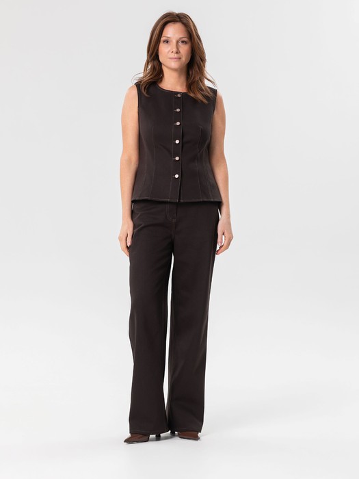 Модель полуприлегающего силуэта, без подклада. Перед и спинка с рельефами. Спереди центральная застёжка на петли и пуговицы. Вырез горловины округлой формы. Жилет декорирован отделочными строчками.