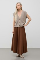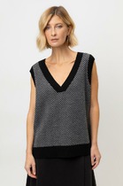 Жилет женский из льняной ткани полуприлегающего силуэта на кружевной подкладке, вырез горловины глубокий V-образный, спинка со средним швом, по переду рельефные швы и листочки (имитация карманов). Застежка центральная на петли и пуговицы. Декоративные элементы из кружева по низу жилета и верхней части проймы в виде рукава-«крылышка».