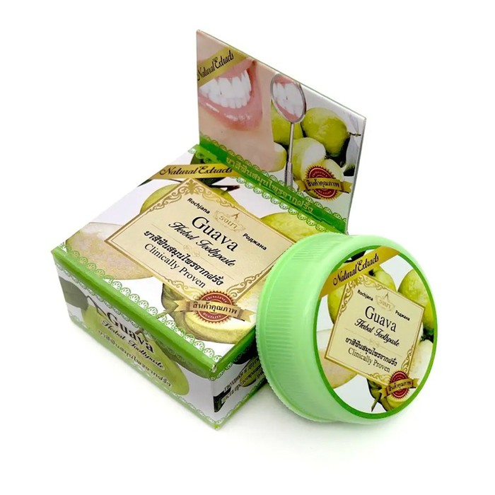 Зубная паста отбеливающая Гуава Rochjana Guava Herbal Toothpaste не содержит в своем составе химических компонентов - красителей, подсластителей, ароматизаторов поэтому полностью безопасна и полезна.Бережно отбеливает зубы, ослабляет воспалительные процессы в полости рта и придает приятный аромат. Обладает сильным антимикробным, антибактериальным, вяжущим и антисептическим эффектом.Помогает бережно растворять зубной камень не повреждая эмали.