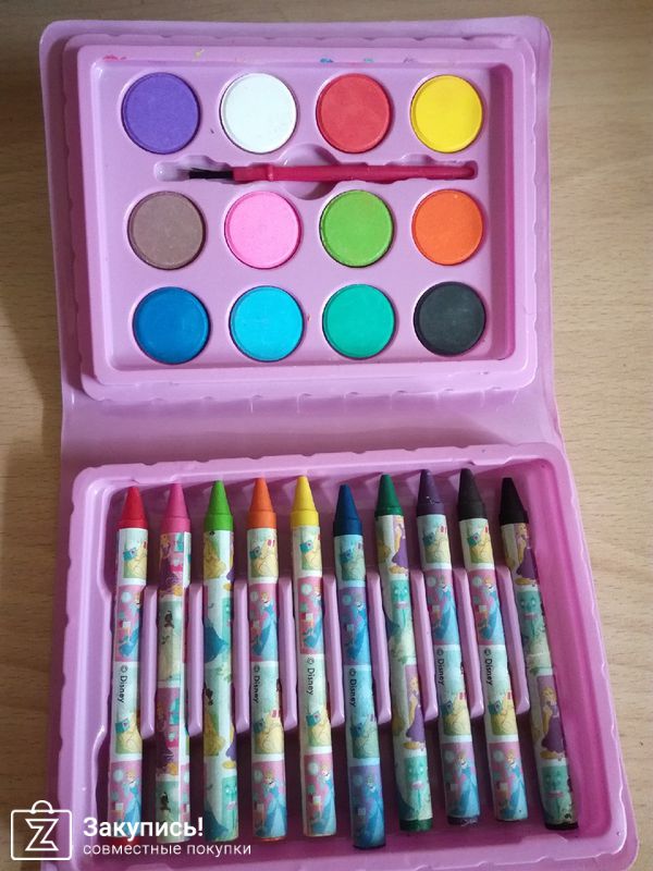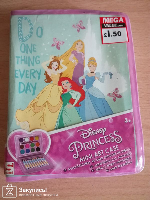 -)набор карандашей и красок Character Mini Art Case Childrens, восковые карандашики и краски с маленькой кисточкой в удобном футляре, можно брать с собой, еще не рисовали ими, стоили 1 фунт.