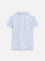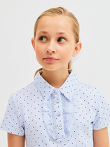 Школьная блузка в горошек для девочек сшита из мягкого и эластичного хлопкового трикотажа - материала подходящего для комфортной повседневной носки. Полуприлегающий крой. Короткие рукава. Спереди застежка на планку и пуговицы. Планка украшена шифоном и кружевом, имитируя воротник - жабо. Пуговицы в тон изделия с мерцающим кристаллом и обрамлением серебряного цвета.