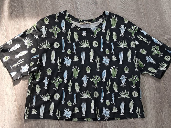 Футболка бренда OStin в хорошем состоянии. Размер S. Изготовлена из хлопка с разноцветным принтом, который добавляет яркости образу. Подходит для повседневного образа.