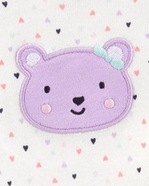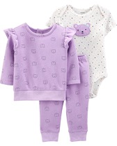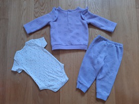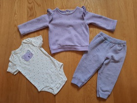 Б/У комплект известного, американского бренда Carters, 3-Piece Bear Little Pullover Set. Комплект из 3 предметов пуловер, боди и штаны для малышки "Фиолетовая медведица". Очень красивый комплект для новорожденной малышки обязательно понравится всем своей расцветкой и мягкостью. Комплект состоит из трех предметов: хлопковый боди, микрофлисовые пуловер и штаны на эластичном поясе. Пуловер имеет удобную застежку - кнопки и украшена симпатичным принтом. Эластичные манжеты на рукавах, а так же на низе пуловера. Прямые штанины с эластичными вставками внизу. Очаровательный боди на запахах, внизу имеет кнопки для быстрой смены подгузника и украшен аппликацией с вышивкой. Костюм очень удобный и мягкий. В таком комплекте ребенок будет нарядным и модным. Термо - этикетка, не царапает нежную кожу малышки. Кнопки не содержат опасного для ребенка Никеля. Усиленное основание для кнопок. Подходит для машинной стирки. Цвет: Purple. Состав: пуловер и штаны: 73% хлопок, 27% полиэстер Микрофлис, боди: 100% ребристый хлопок. Размер: 12M для девочки 12 месяцев, ростом 72-76 см, весом 9,3-11,1 кг. Состояние: б/у, хорошее (полиняли штанишки).