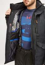 Горнолыжная мужская куртка имеет съемный капюшон на молнии и два фиксатора по бокам. Верх капюшона с фиксатором, регулирующим глубину. Два нагрудных кармана, правый прикрыт ветрозащитной планкой. Два накладных кармана с потайным прорезным на молнии. Манжеты рукавов на регулируемых липучках с эластичными вставками с прорезью для пальца. Ушки капюшона фиксируются липучками и кнопкой и закрыты планкой. На воротнике курки шита ткань для защиты от натирания шеи и подбородка. На груди с правой стороны, на левом рукаве (в районе предплечья) фирменный логотип MTFORCE. Внутренняя часть куртки от плеча до пояса имеет систему omni-heat с фирменным логотипом компании, также подкладка спины выполнена из дышащего материала для улучшения циркуляции воздуха. Внутри имеется два накладных кармана из сетки. С внутренней стороны изделия имеется держатель для наушников, а также, дополнительный боковой карман (слева) на молнии. На ярлыке с правой стороны, присутствует голограмма с фирменным логотипом. Внутри рукавов материал подклад 100% полиэстер. Двойная молния имеет ветрозащитную планку на липучках и кнопках. Есть крючок-держатель.