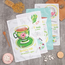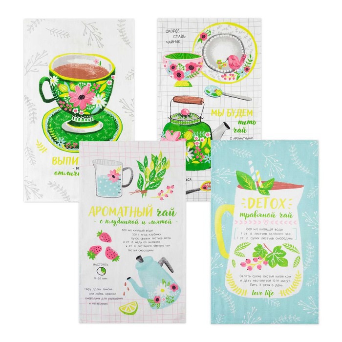 Яркие полотенца для кухни с написанными рецептами заварки чая на полотенцах