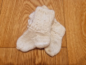 Новые шерстяные вязаные носочки. Отличное решение на зимнее время года. Украшены завязками на шнурке, для дополнительной фиксации. Цвет: белый. Состав: 100% шерсть. Размер 0-6 M, для новорожденного 0-6 месяцев, ростом 50-60.