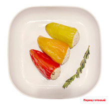 Состав: перец сладкий, курица/индейка рубленая, рис отварной, морковь, лук репчатый, чеснок, перец чёрный, лавровый лист, соль