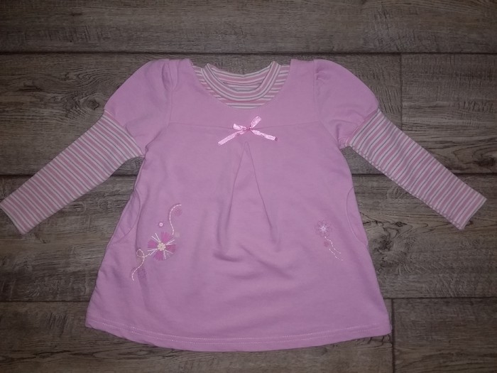 Теплое и уютное трикотажное платье-туника изготовлено из износоустойчивого и практичного интерлока, мягкое и приятное на ощупь, отличается хорошей воздухопроницаемостью. Эффектный вид платью придает необычное сочетание однотонного материала и материала в полоску, а также рукава-фонарики, аппликации и встречная складка на лифе.