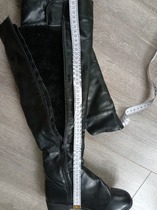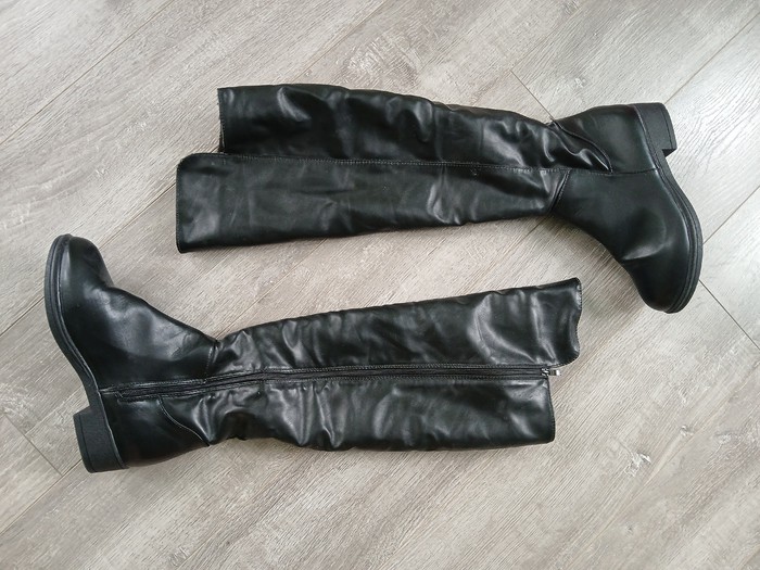Женские высокие сапоги ботфорты черного цвета, размер 38. Изготовлены из экокожи с искусственным мехом внутри. Высота голенища от пятки составляет 52 см, каблук 3 см. Подошва устойчивая и износостойкая, подходит для разных погодных условий. Состояние отличное, надевались всего один раз в помещении для фотосессии.