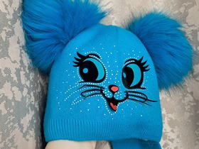 Детская шапка голубого цвета с изображением мордочки кота. Состояние хорошее, носилась регулярно, но сохранила внешний вид. Подходит для ребенка 4-6лет.