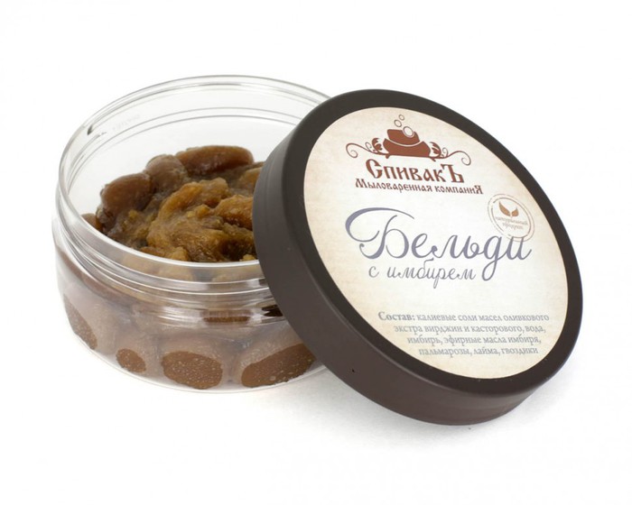 Бельди с имбирем необычное с насыщенным пряным ароматом. Вместо трав содержит порошок сушеного имбиря, который обеспечивает мягкое, но глубокое очищение, и тонизирует кожу. Эфирные масла имбиря, лайма, пальмарозы и гвоздики способствуют нормализации работы сальных желез, обладают антисептическими свойствами и повышают упругость кожи.